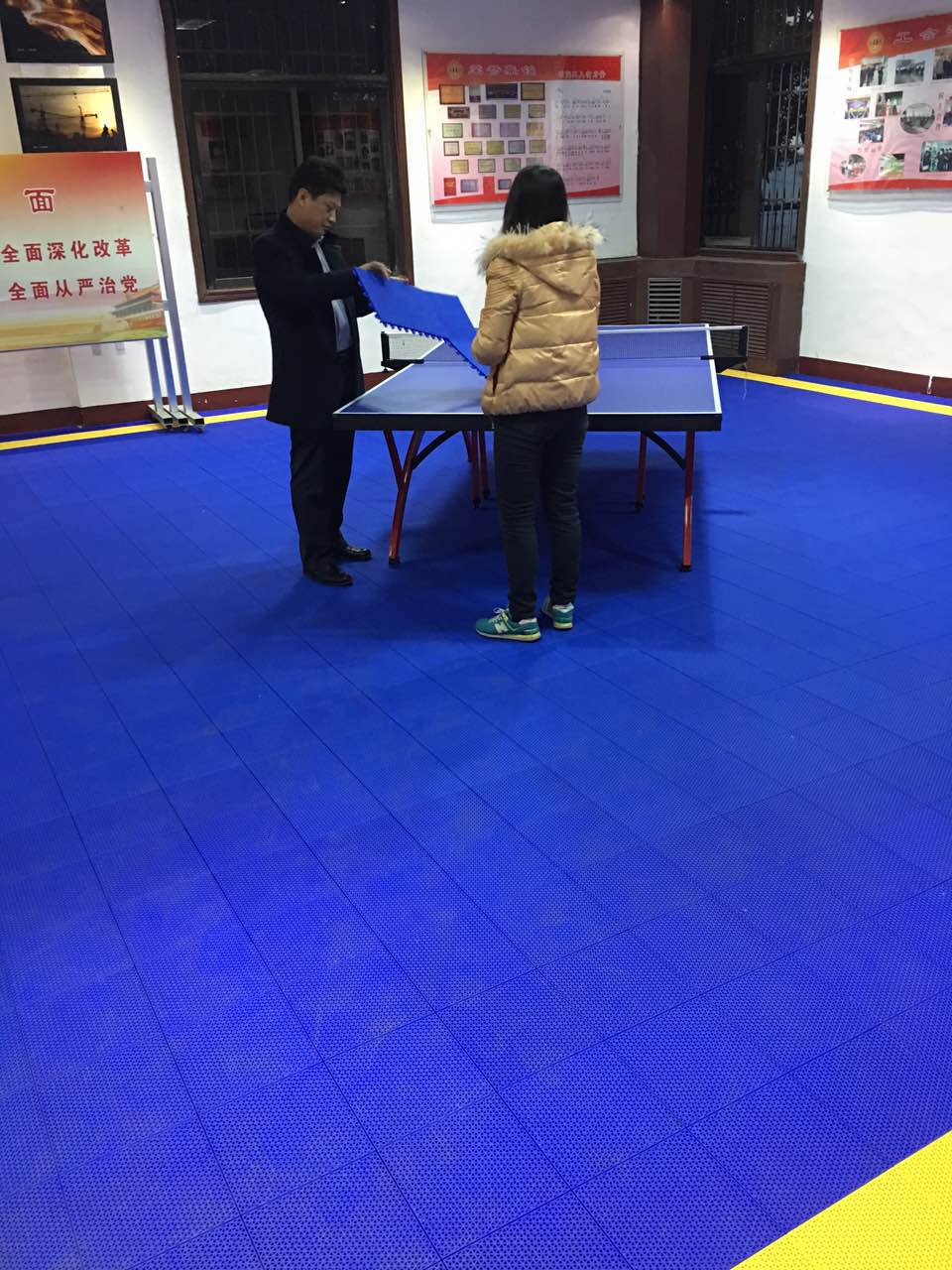 12月15日,仲達(dá)塑膠帶著懸浮拼裝地板來到了孟莊鎮(zhèn)政府,此次美化的場所是政府所設(shè)的一個乒乓球活動室,我們采用的色調(diào)主要以深藍(lán)色為主,黃色為輔,突出沉穩(wěn)、理智的意境,在保護(hù)運動員安全的同時營造了良好的氛圍,生產(chǎn)原料為食品級聚丙烯,健康性不言而喻,.可回收利用。